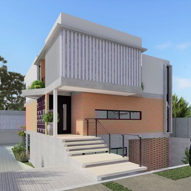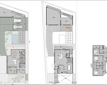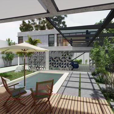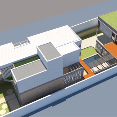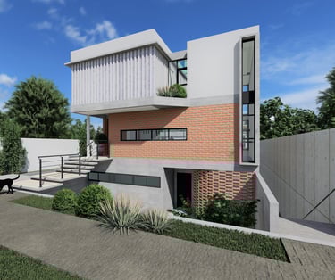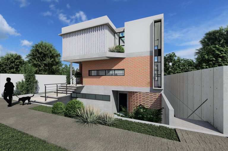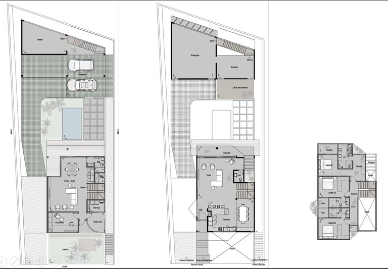 A implantação tira partido do lote longitudinal e do desnível natural para distribuir as funções com clareza. O ateliê e a área de produção, acessíveis diretamente pela rua, se posicionam no nível inferior ao corpo principal da residência, o que garante independência de usos e mantém a privacidade dos ambientes domésticos. A residência, em seus três níveis, se organiza de forma escalonada, favorecendo ventilação cruzada, iluminação natural e integração com áreas verdes.