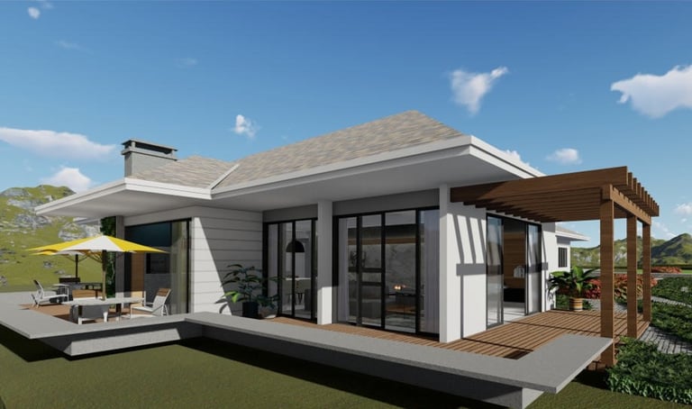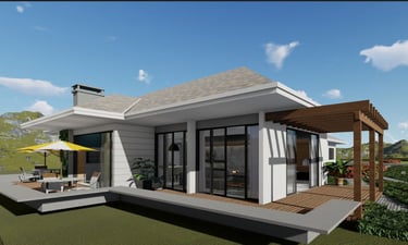 Este projeto foi pensado para um casa térrea, tendo em vista uma melhor mobilidade, sua distribuição e bem distinta, a planta esta em formato de "T" a face norte atinge a sala no período da manha e nos quartos o sol da tarde.